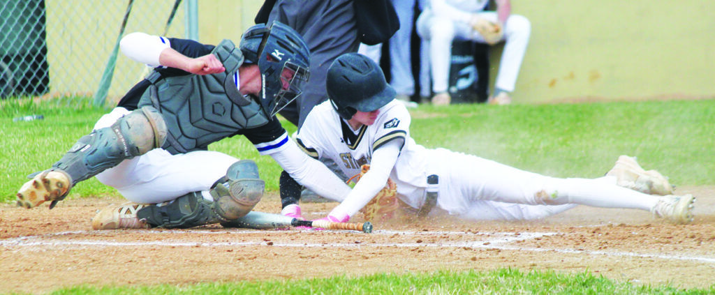 Corvallis’s Reese Earp tags out Stevensville’s McCoy Endres at home plate in Stevi’s 6-5 victory over Corvallis on Tuesday, April 22. Photo by Scott Sacry.