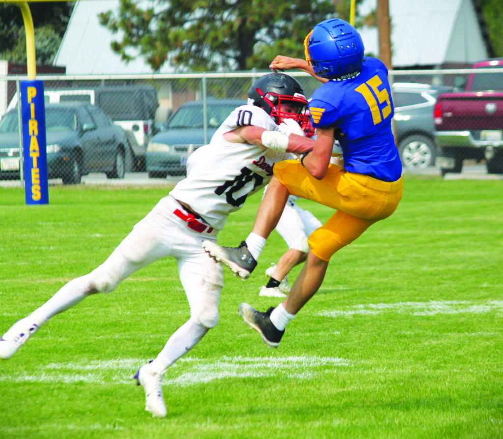 Darby’s McCoy Townsend hits Victor’s Sawyer Agee as he throws the ball in Darby’s 34-0 victory over Victor on Saturday, September 6 in Victor.