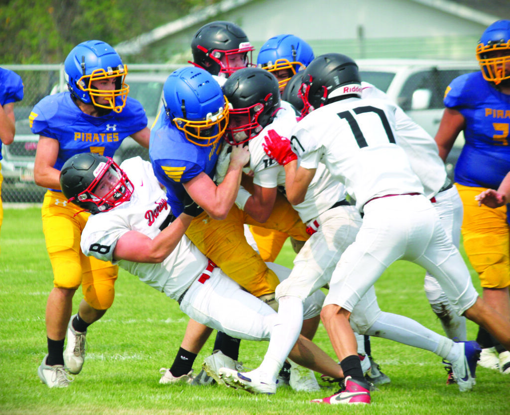 Victor’s Colin Lewis (#7) gets swarmed by a group of Darby defenders led by Darby’s #8 Wyatt Manning. Photos by Scott Sacry.