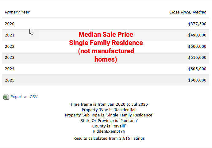 The median sale price for single family homes in Ravalli County has gone from $377,000 in 2020 to $600,000 in 2025. Credit: MLS.