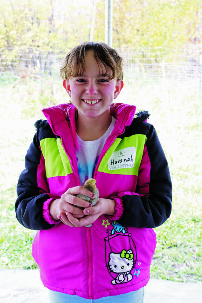 Havanah Davis, a youth intern with Cultivating Connections Montana, holds a baby chick and mans the booth where young children can interact with baby birds. Photo by John Dowd.