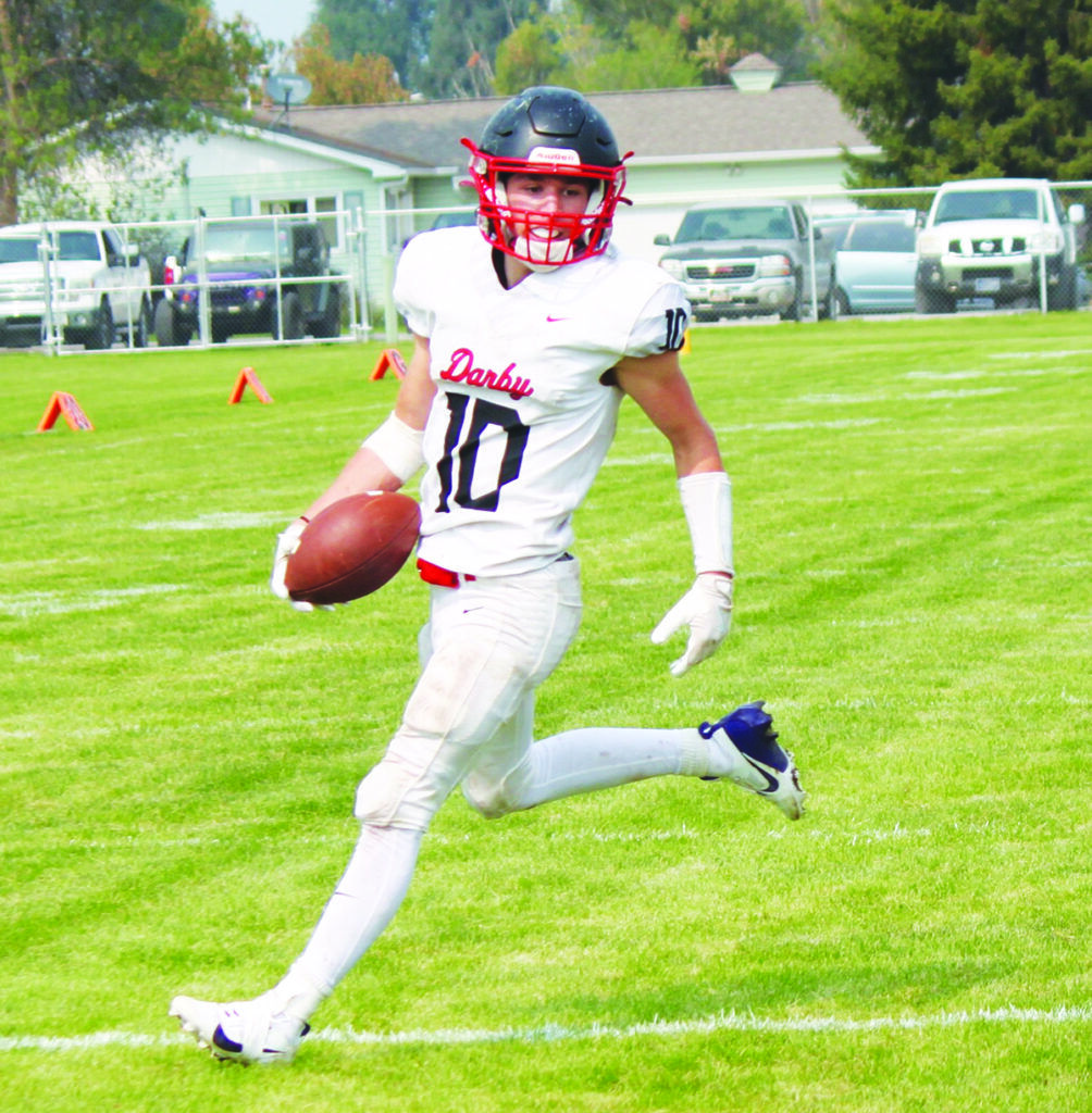 Darby’s McCoy Townsend had a monster game in Darby’s 40-36 win over St. Regis on Friday, October 3 in Darby. Townsend rushed 41 times for 313 yards and scored 6 touchdowns. Photo by Scott Sacry.