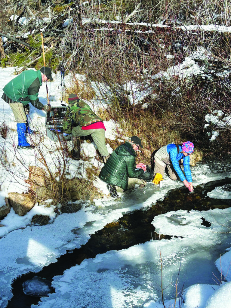 Bitterroot River Protection Association volunteers Mark Van Loon, Doug Soehren, Larry Campbell and Michele Dietrich collecting water samples from Johnson Creek in the area of the proposed Sheep Creek Mine. Photo by Michael Howell.