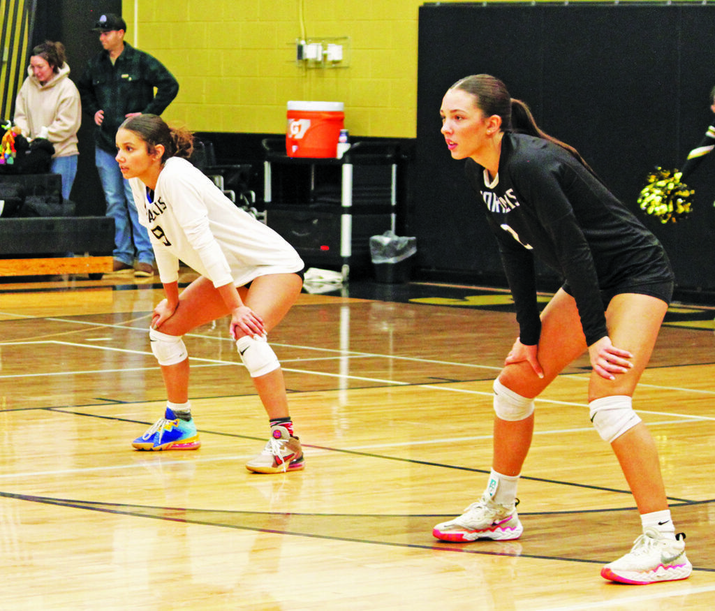Corvallis’s Nahiya Jennings (#9) and Olivia Potter (#2) prepare to receive a serve in Corvallis’s divisional play-in game against Stevensville on Saturday, Nov. 1. Corvallis lost 0-3. Photo by Scott Sacry.