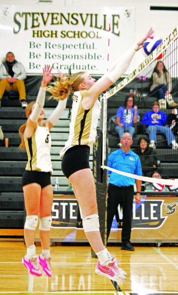 Stevensville’s Kyndahl Plantz makes a block in Stevensville’s 3-0 victory over Corvallis in a divisional play-in game in Stevi on Saturday, Nov. 1. The Hamilton and Stevi volleyball teams will compete at the Western A Divisionals in Libby on Nov. 6-8. Photo by Scott Sacry.