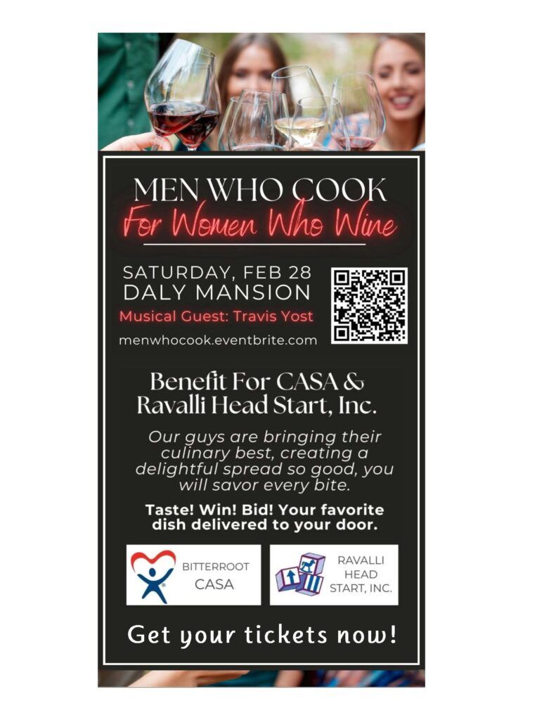 Ravalli Head Start and Bitterroot CASA have joined forces on an event to raise both funds and public awareness for these two vital programs. “Men Who Cook for Women Who Wine” will take place on Saturday, February 28 from 5 to 8 p.m at the Daly Mansion. Ten volunteer chefs from the local community will provide delicious samples of their culinary creations. One of the chefs is Roch Turner, who happens to be Bitterroot CASA’s executive director. Another is Dominic Farrenkopf, mayor of Hamilton. According to Craig, no one will go away hungry. Travis Yost will provide musical entertainment, and there will be fun events like a wine ring toss, an auction for the favorite food items and more. Tickets are $75 per person and include food and two drinks and can be purchased online at menwhocook.eventbrite.com or at the door if not sold out.