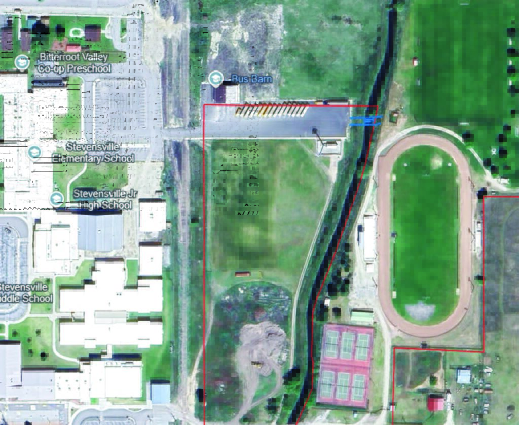 Proposed site for a new bridge over the Supply Ditch to connect Stevensville High School with the athletic fields is shown in blue.