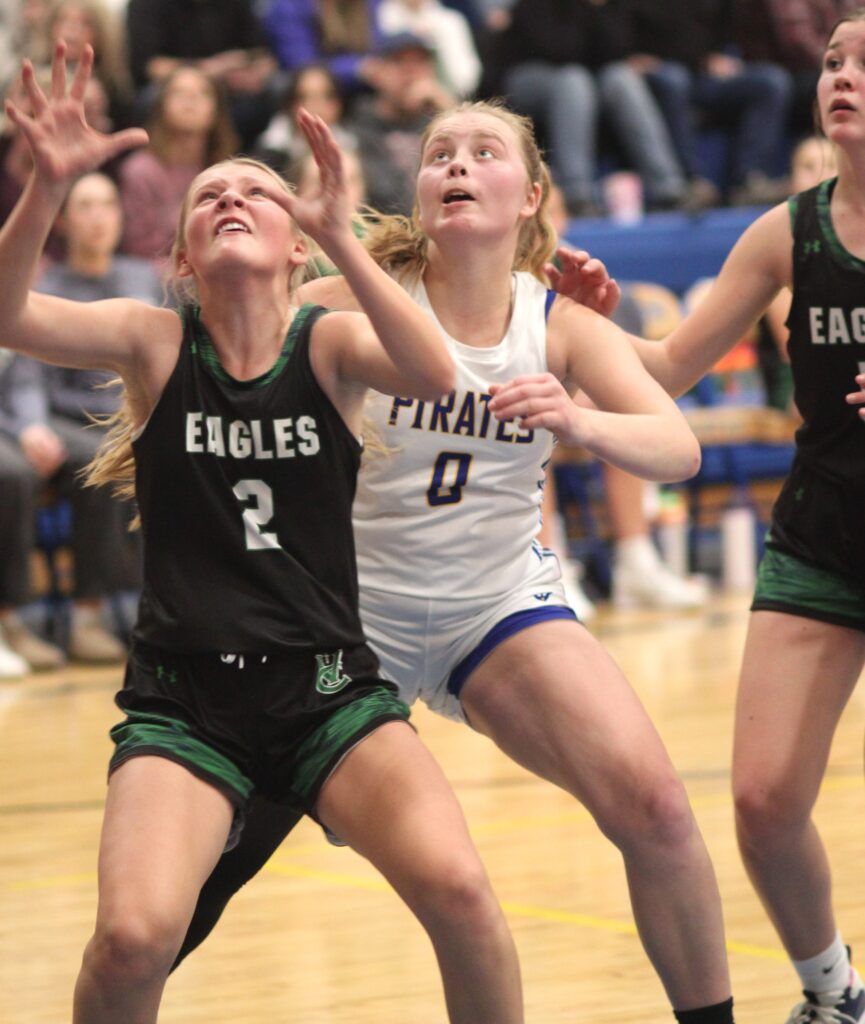 Victor’s Whitney Bugli fights for a rebound. The Victor girls were eliminated from the 13C District tournament in Frenchtown on Saturday, February 21. Photo by Scott Sacry.