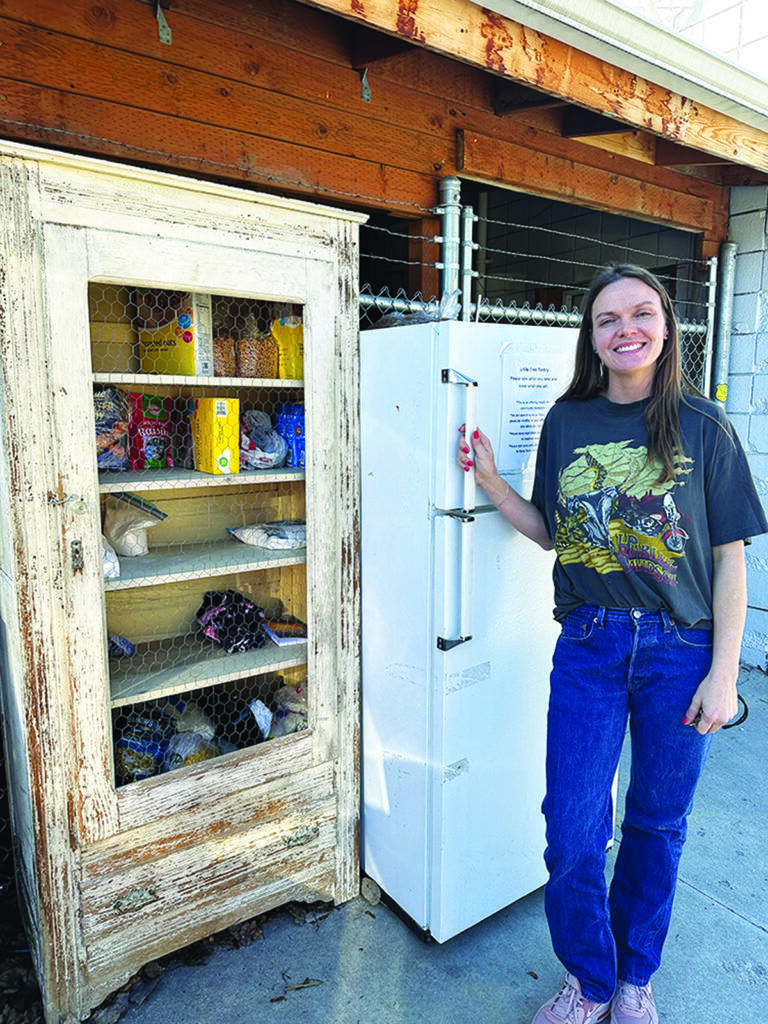 Katelynn Rennaker at the little food pantry she created in the alley behind her Bitterrooter Clothing business in Stevensville. The pantry offers a variety of free food for anyone who needs it, and is stocked by generous local folks who are willing to share their bounty. Photo by Victoria Howell.